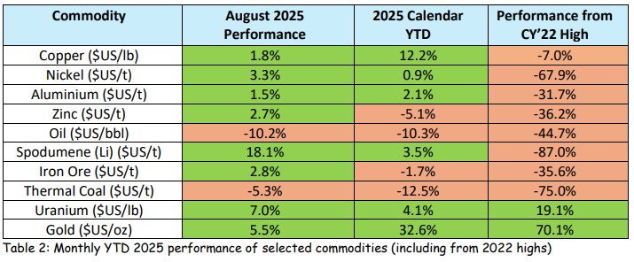 In commodities, during August all key industrial minerals showed price rises with lithium concentrate showing a price spike (+18.1%) due to the shutdown of a significant volume of Chinese production. This price rise brought our lithium stocks to life with the share price of Pilbara Minerals and Mineral Resources being significant beneficiaries.
