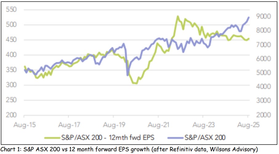 In this regard there are plenty of “top down” arguments why the share market should continue to rise; falling interest rates for one, a return to global growth as the US (apparently) powers ahead and major EU economies such as Germany reindustrialise through defence spending.