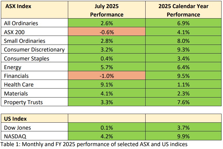 July 2025 opened positively as the Australian market adjusted to the new Trump world order and the raft of tariffs that were being negotiated across the United States major trading partners.