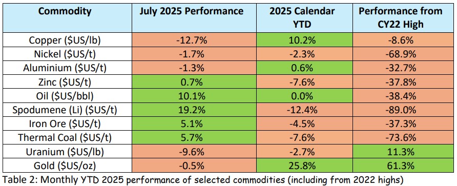 Across resources, July was a mixed month highlighted by a strong recovery in lithium prices, the result of the suspension of some Chinese production. In contrast, copper retreated sharply from recent highs, as it showed a savage retreat from recent highs as Donald Trump backed away from tariffs on copper entering the United States.