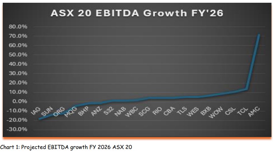 The following chart shows the projected growth in EBITDA (earnings before interest, tax and depreciation and amortisation) for FY 2026 for the stocks in our ASX 20 index.