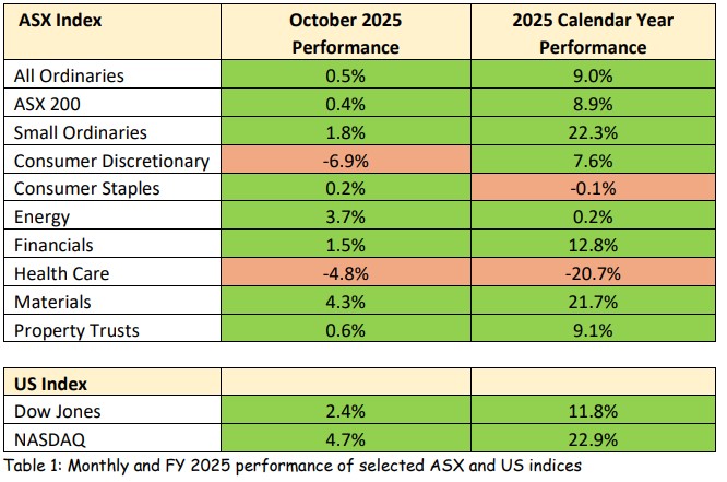 While these concerns persisted through the month, they appeared only to spur US equities higher, with the Dow gaining 2.4% and the NASDAQ a strong 4.7%. Much of this optimism reflected anticipation of a second US rate cut for the year – which the Federal Reserve duly delivered on 29 October, reducing its benchmark rate by 0.25% to a target range of 3.75%–4.00%.