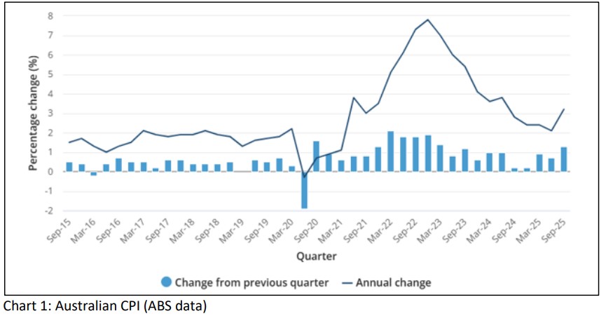 This reading sits above the RBA’s 2.0–3.0% target band and reflects a quarterly CPI rise of 1.3%, driven largely by higher energy costs as State and Federal Government subsidies were wound back.