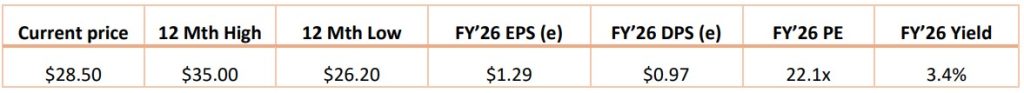 The stock is now trading around levels last seen in 2019. While FY26 will clearly be a year of transition, we believe the Company’s fundamentals remain sound and that, as the restructuring is completed, the share price should ultimately recover. Patience, however, will be required.